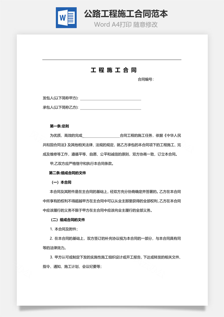 本模板为公路工程施工合同范本,文字图片可以直接替换,使用简单方便