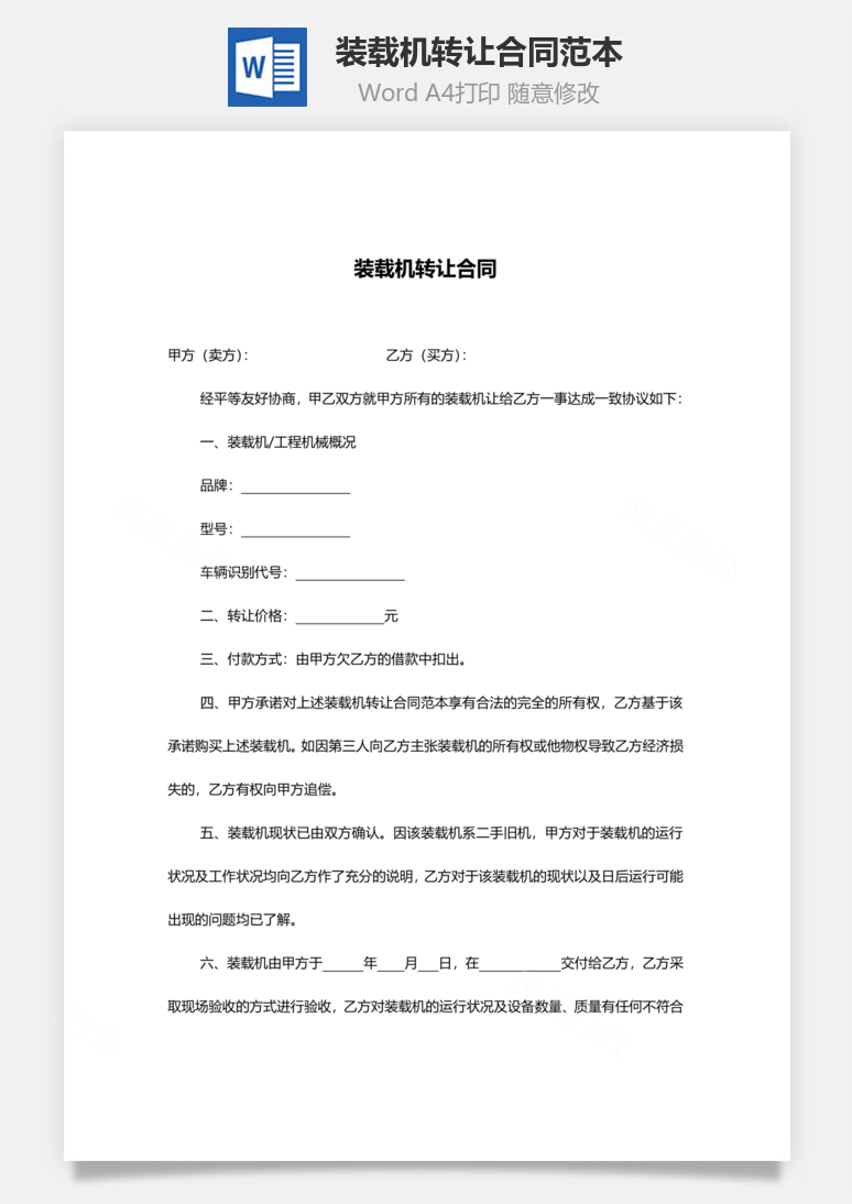 本模板为装载机转让合同范本,文字图片可以直接替换,使用简单方便